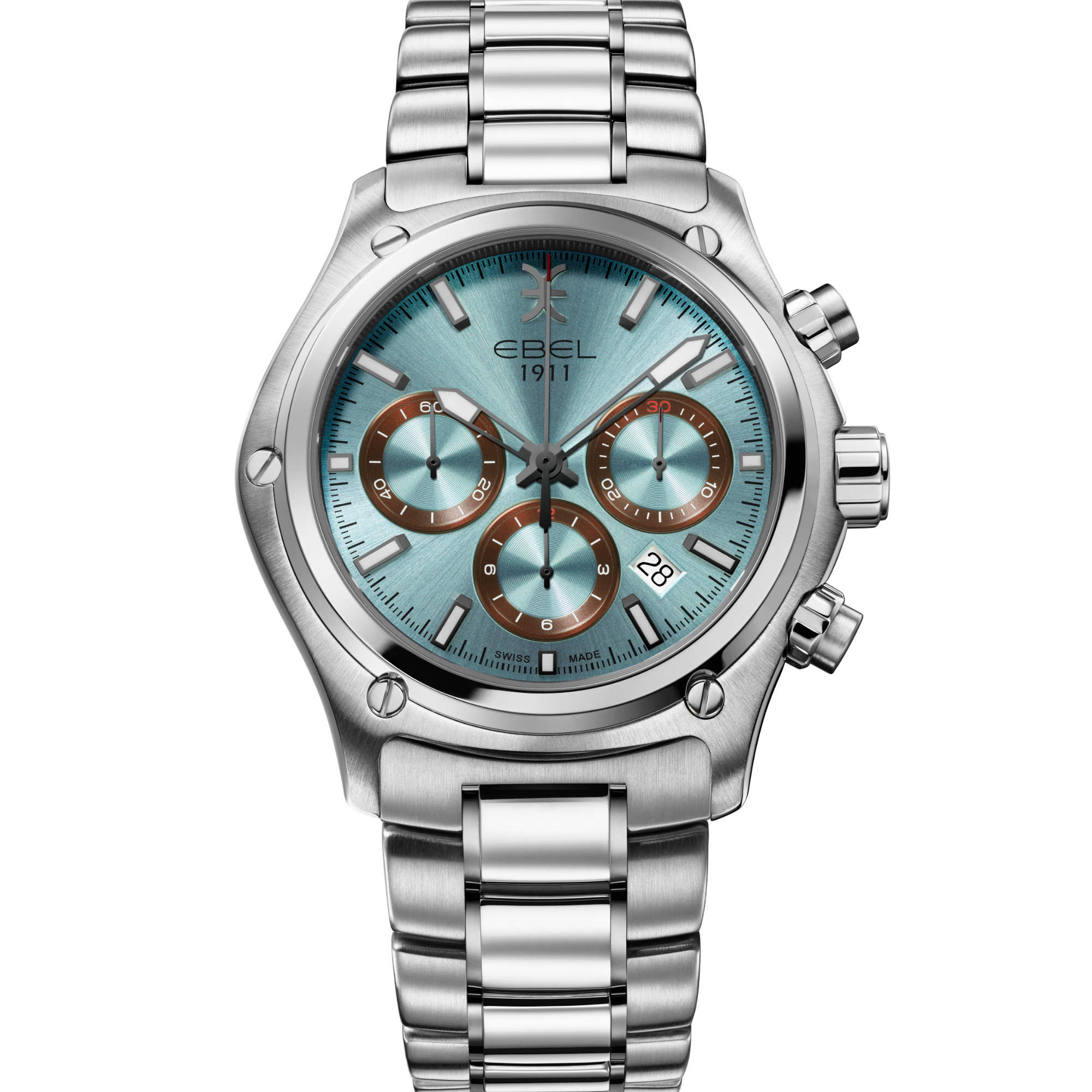 Ref. 1216680 – EBEL 1911 Herrenuhr, Gehäuse aus Edelstahl, Ø 44 mm, eisblau galvanisiertes Zifferblatt mit applizierten Super-LumiNova® Indizes, Datumsfenster auf 4:30 Uhr, innenseitig entspiegeltes Saphirglas, Gehäuserückseite aus Saphirglas, Armband aus Edelstahl, Faltschließe, zusätzliches schwarzes Kalbslederband, Schweizer Automatik-Chronographenwerk, wasserdicht bis 10 bar.