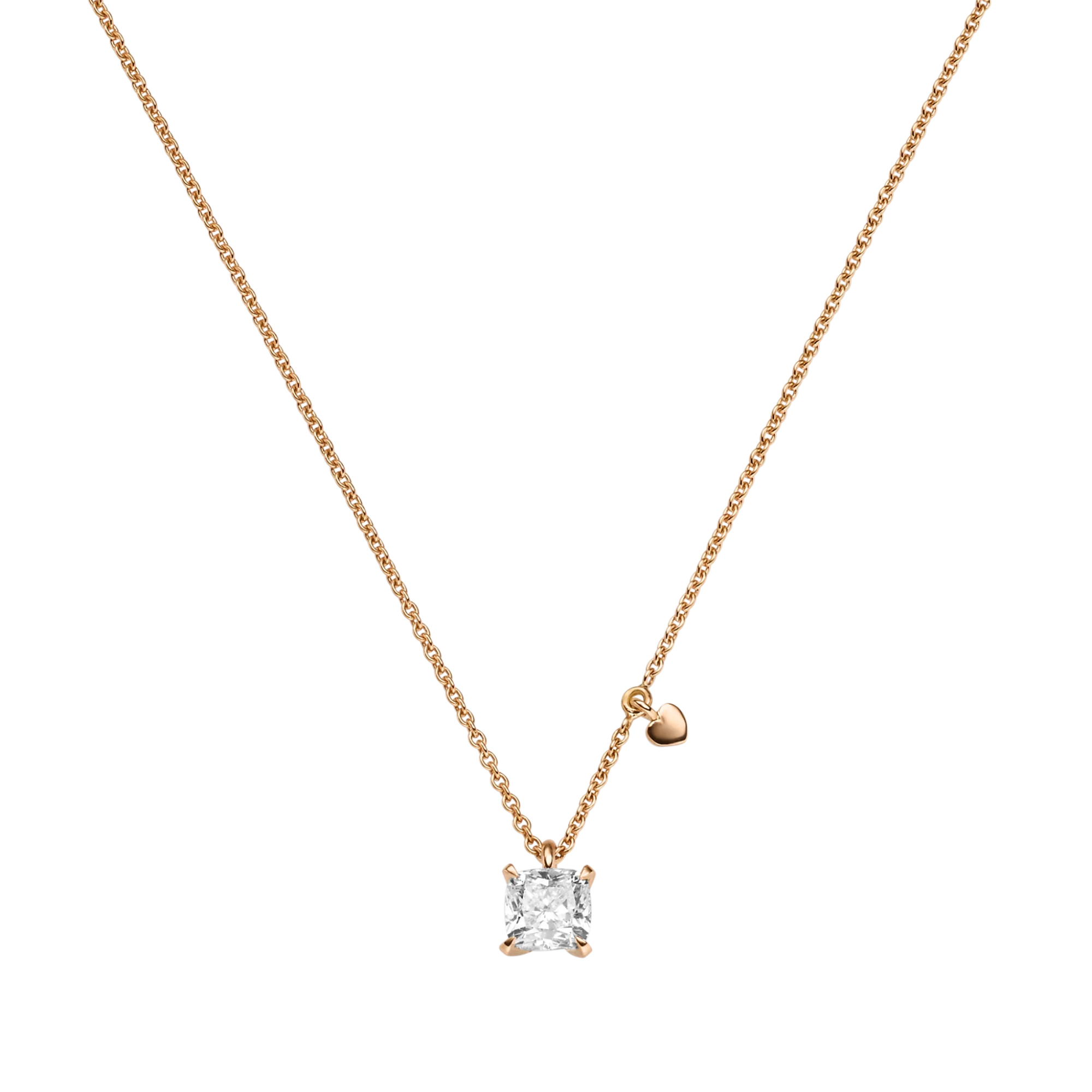 Ref. 30-0986973-9040 – Der Cushion Cut oder auch Candlelight Cut genannt, zählt zu den ausdrucksstärksten Diamantschliffen. Dieser Kissenschliff hat bedingt durch seine Anordnung der Facetten eine hohe Lichtstreuung, was zu einem außergewöhnlichen Farbspiel führt. Der Anhänger, an dessen Collierkette ein kleines Herz mit eingearbeitet ist, ist ab 0,45 ct. erhältlich – ein individuelles Schmuckstück mit weißen oder naturbraunen Diamant.
