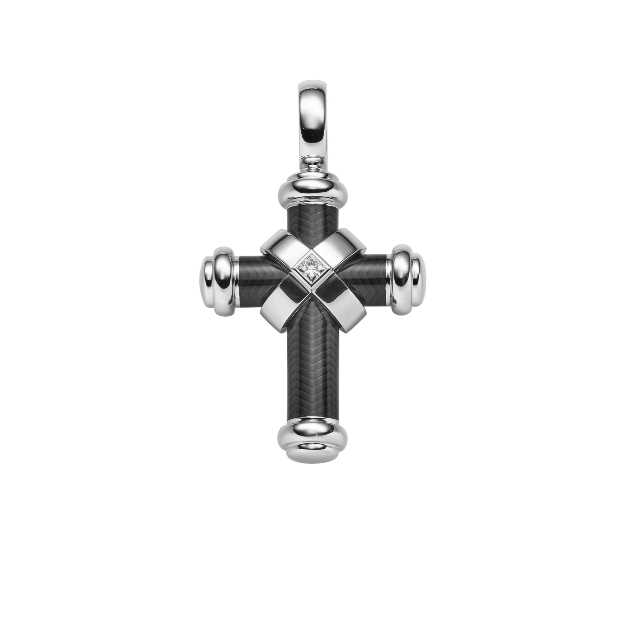 Ref. 20-0946871-1000 – Das Kreuz mit ausgefallener Struktur im grauen Kaltemaille trägt im kantigen Überschlag den klaren Prinzess Cut Diamanten