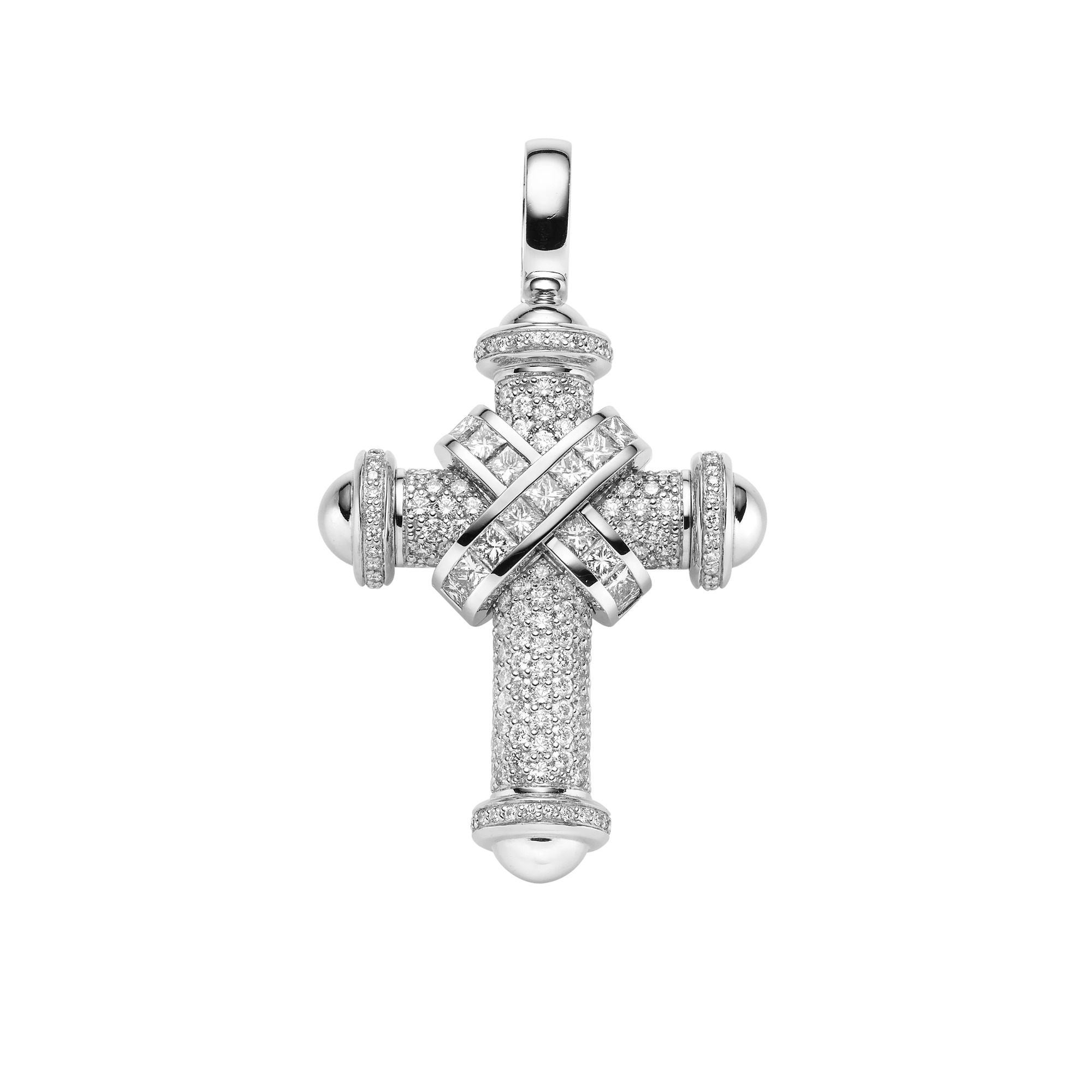 Ref. 21-0920771-1000 – Das luxuriöse Leo Wittwer Kreuz ist komplett mit Diamanten besetzt. Der Korpus und Teile der Seitenkappen sind mit Brillanten ausgefasst. Der Überschlag ist mit großen Prinzess Cut Diamanten geschmückt – Luxus pur