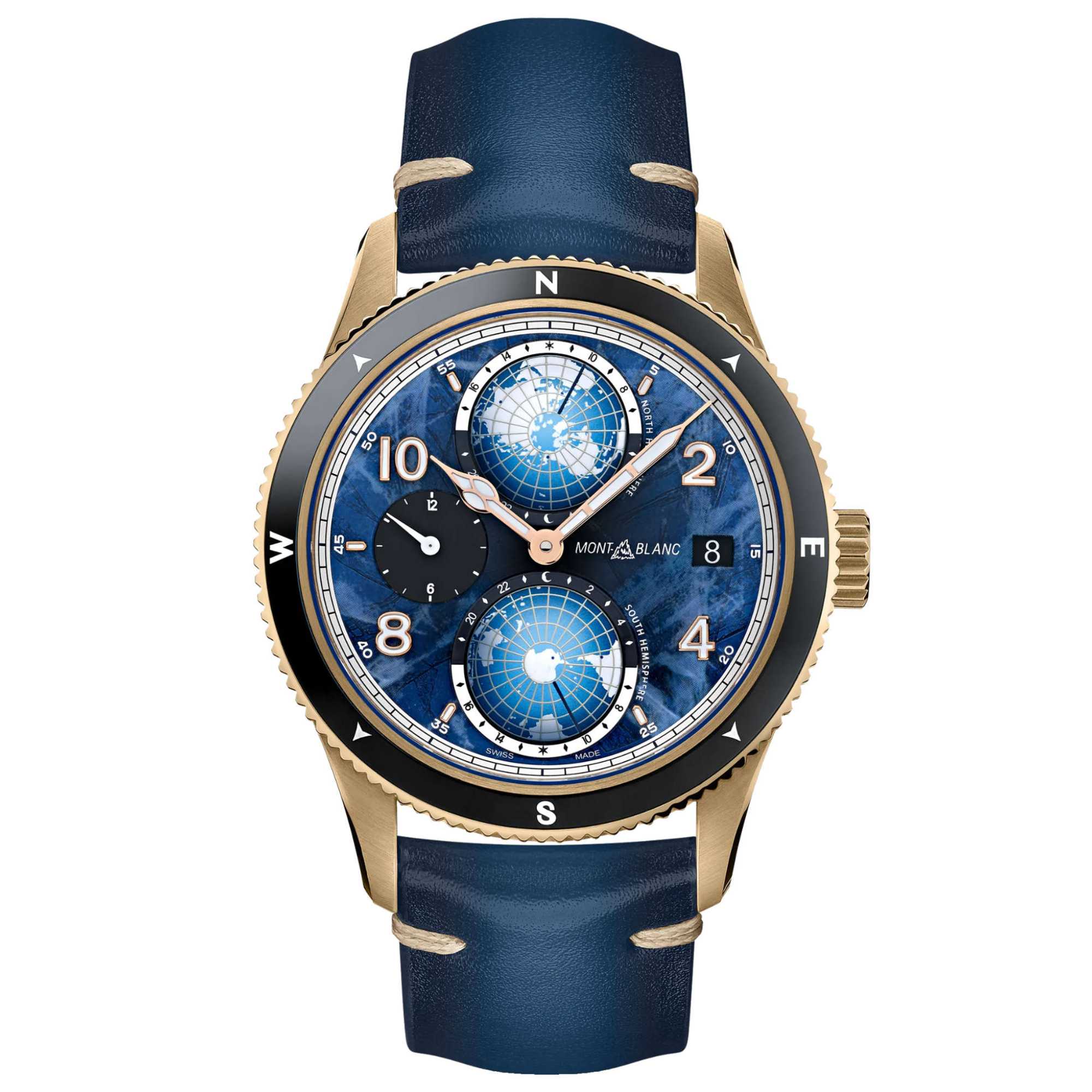 Die Uhr verfügt über ein 42-mm-Bronzegehäuse mit einer beidseitig drehbaren geriffelten Keramiklünette mit den vier Himmelsrichtungen mit Leuchtbeschichtung und über das Zifferblatt mit Gletschermotiv der Maison.